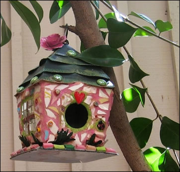 Recycled Chinese Metal Birdhouse – vintage plates, vitreous glass & found objects